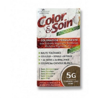 3 CHÊNES COLOR & SOIN ADVANCED - 5G CHÂTAIN CLAIR DORÉ est une coloration permanente à haute tolérance pour cuir chevelu sensible. Cette teinture nouvelle génération qui contient des extraits végétaux renforcés et riche en pigments purs, est encore plus douce et apporte protection et nutrition et donne une couleur intense et profonde.